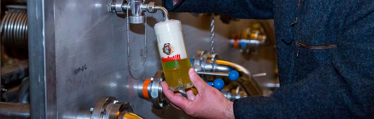 Halten Sie das saubere und mit kaltem Wasser vorgespülte Glas schräg unter den voll geöffneten Zapfhahn und füllen Sie es bis zur Hälfte auf. Nach einer Minute Wartezeit wird nachgezapft.